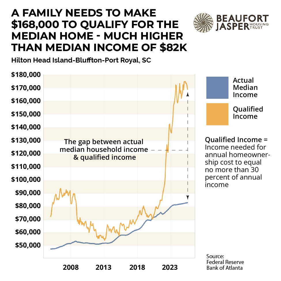 A family needs to make $168K to qualify for the median home in Hilton head – much higher than median income of $82K. This gap has widened dramatically since 2020. Source: Federal Reserve Bank of Atlanta
